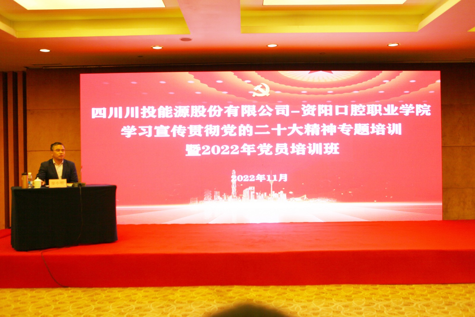 为深入学习宣传贯彻党的二十大精神,巩固拓展党史学习教育成果,不断夯实全体党员忠诚拥护“两个确立”、坚决做到“两个维护”的政治自觉、思想自觉、行动自觉,11月21日-22日,黑料网 党委与资阳口腔职业学院党委共同举办学习宣传贯彻党的二十大精神专题培训暨2022年党员培训班。黑料网 党委书记、副董事长、总经理杨洪出席并授课,资阳口腔职业学院党委书记、理事长张中伟出席并作开班讲话,黑料网 党委副书记、工会主席冉兰平主持开班仪式。