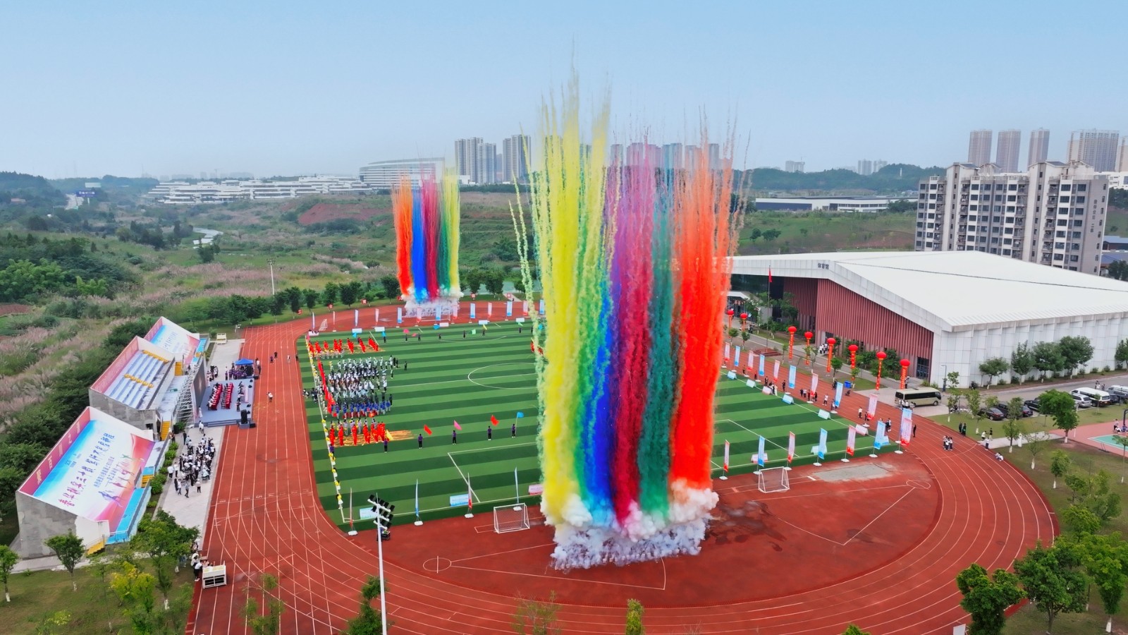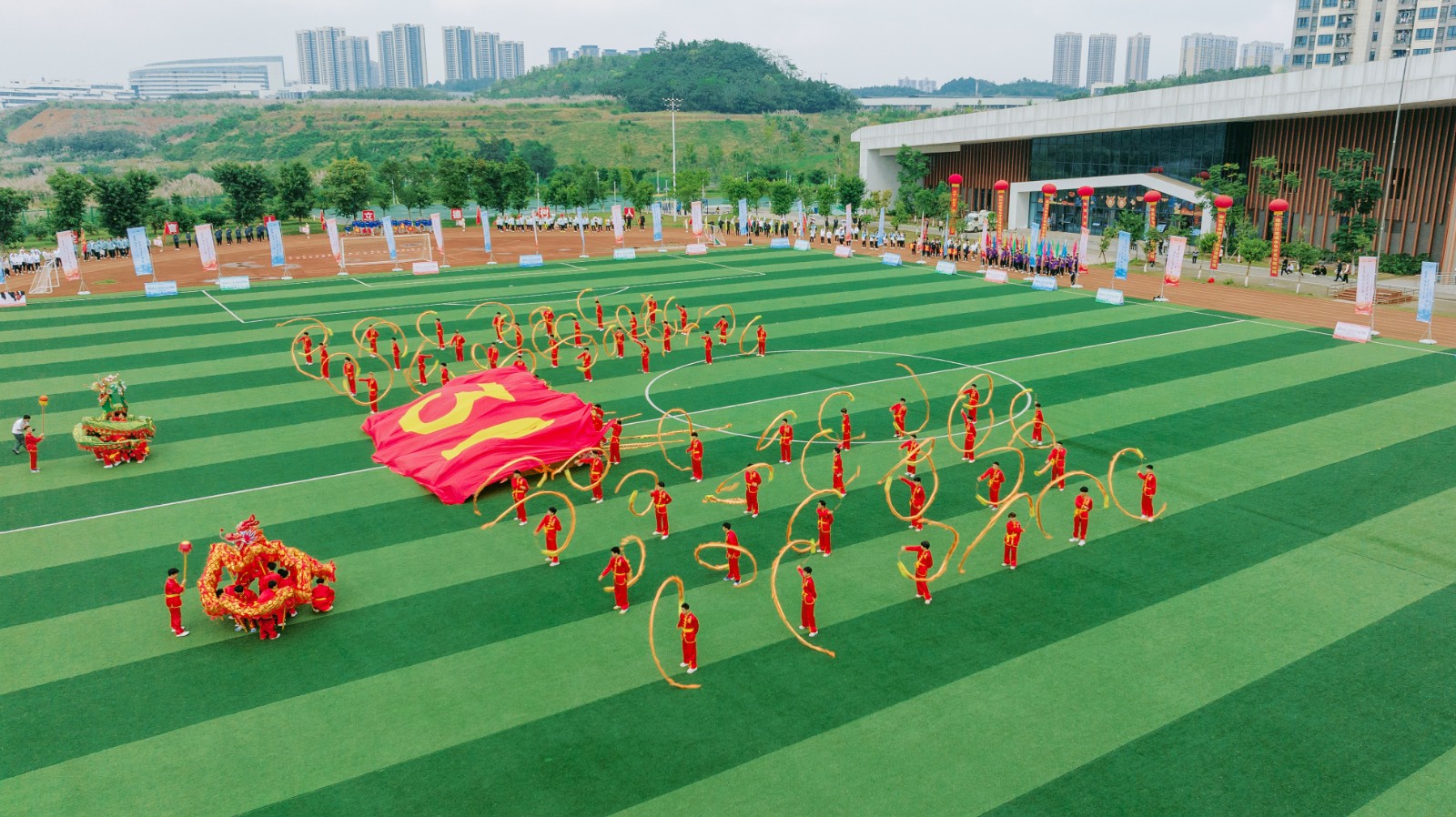 开幕式现场,彩旗招展,气氛热烈。15时整,在气势恢宏的舞龙表演后,运动会开幕式正式开始。伴随着激昂的旋律,仪仗队员护拥着鲜艳的五星红旗健步入场。随后,各参赛代表团依次入场并进行风采展示,精心准备的舞蹈、歌曲等文艺节目,引燃全场气氛。入场式后,全场起立,高唱中华人民共和国国歌。在雄壮的国歌声中,鲜艳的五星红旗冉冉升起,迎风飘扬。