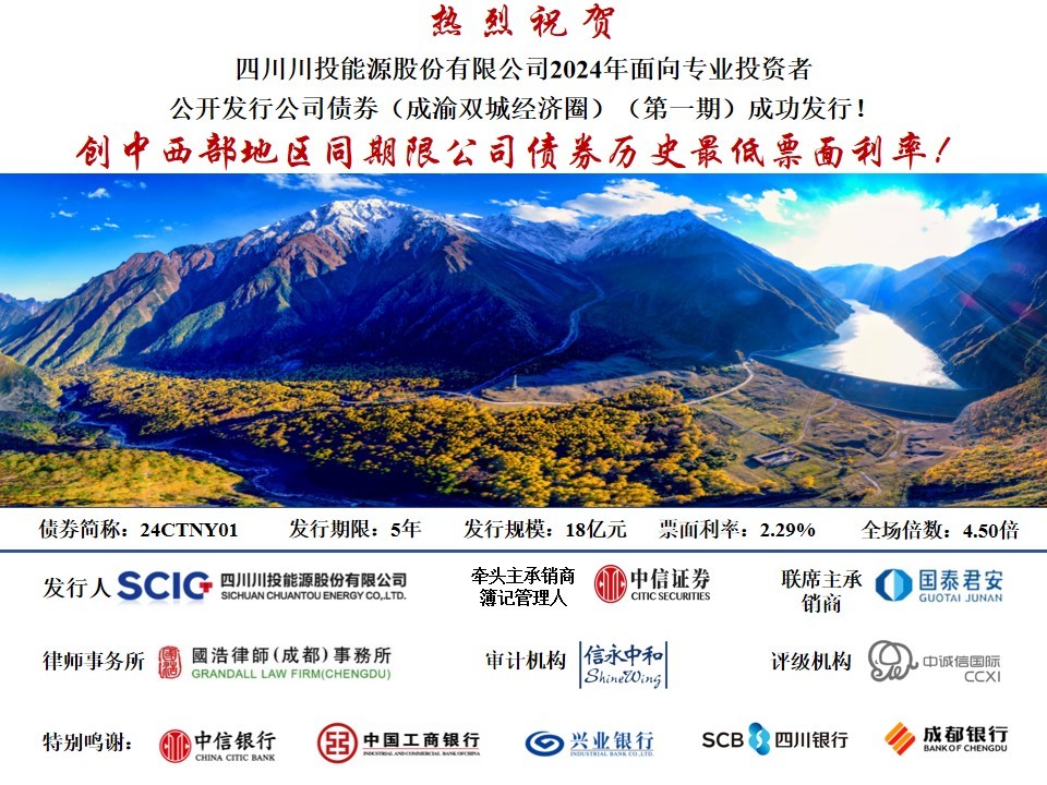 7月10日,黑料网 2024年面向专业投资者公开发行公司债券(成渝双城经济圈)(第一期)成功发行。本期公司债券发行规模18亿元,期限5年,票面利率2.29%,创中西部地区同期限公司债券历史最低发行票面利率。