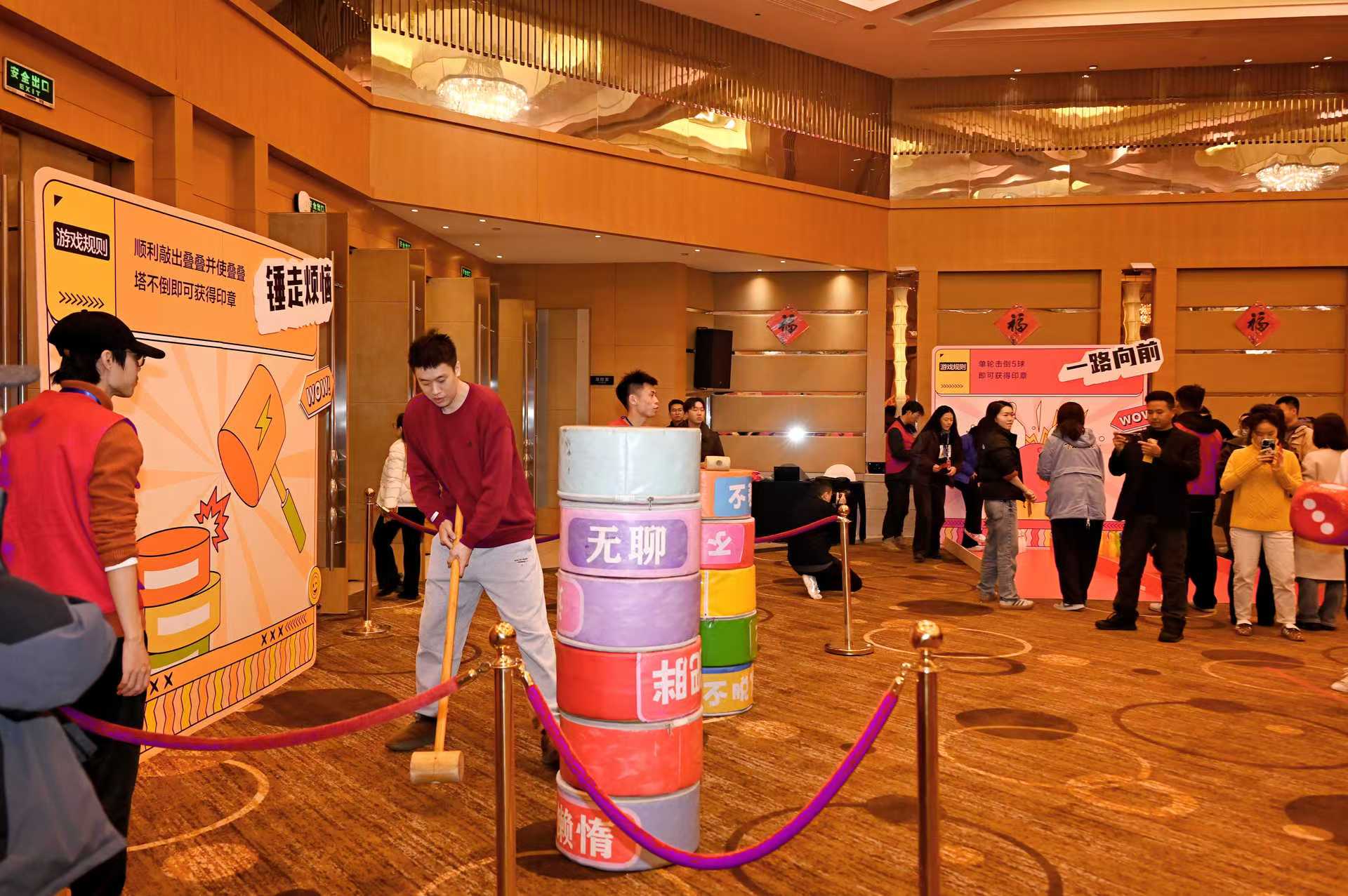一路向前区,职工们轮流上阵,用力掷出保龄球,体验运动的乐趣与激情;锤走烦恼区,职工们通过敲击“烦恼圈”,释放压力,享受智慧与技巧的碰撞 ;蛇舞新春区,参赛者屏息凝神,用尽全力推动小球,看它在赛道上蜿蜒;拼出未来区,只见每位职工选手抱着不同颜色和形状的“方块”,构建图案并迅速完成拼装。