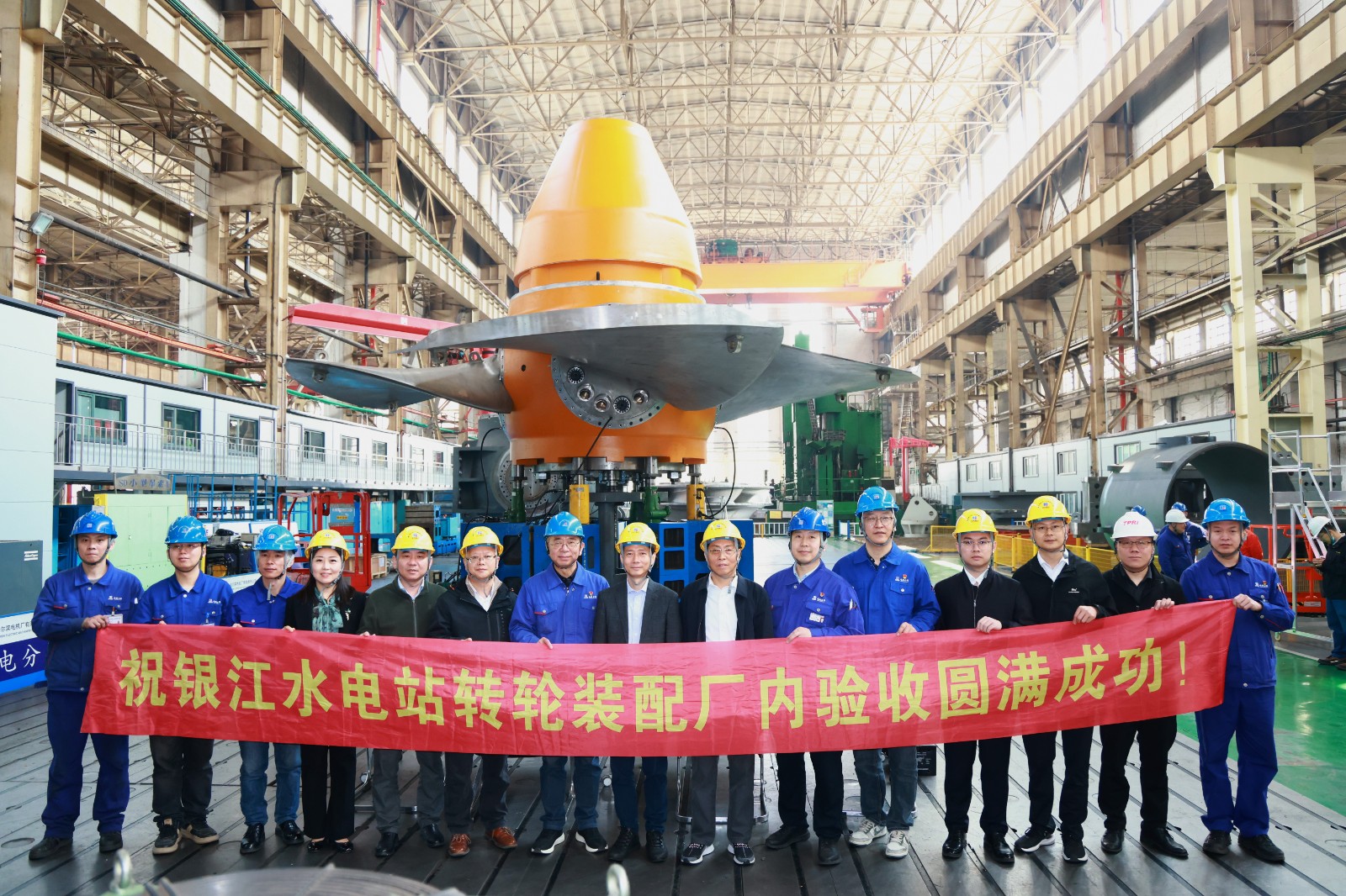 转轮是水力发电机组的核心部件之一。银江水电站安装有6台单机容量为6.5万千瓦的水轮发电机组,所采用的转轮具有设计难度大、制造难度高等特点。为确保银江水电站的工程建设进度,27日当天,在哈电集团哈尔滨电机厂内,验收组依据设计图纸、技术规范及行业标准,对转轮本体尺寸精度、焊缝质量、动平衡试验数据、桨叶预装配合度等12项核心技术指标进行了现场实测与资料复核。经多维度综合评定,转轮装配各项技术参数均符合设计规范要求,设备制造质量达到优良标准,交货进度满足项目节点计划,顺利完成验收。