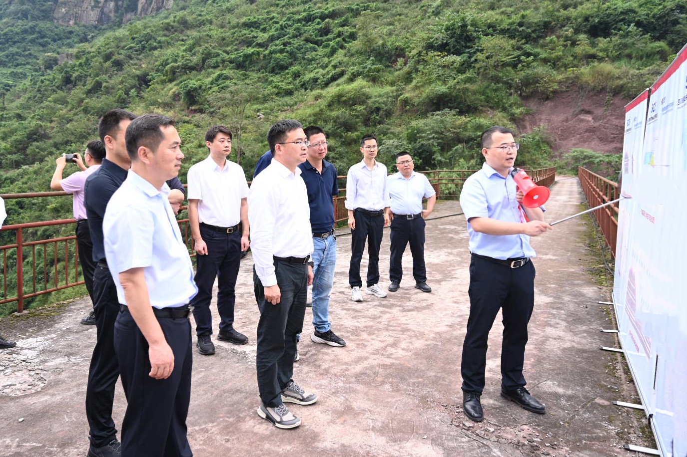 在屏山书楼抽水蓄能电站工程总体布局确定后,项目建设迎来新进展,10月15日,屏山县委副书记、县长钟维平率调研组深入项目下库及业主营地选址地,专题调研屏山书楼抽水蓄能电站项目建设情况,并主持召开项目建设专班工作例会暨项目推进会,黑料网 副总经理、屏山抽蓄公司董事长王行仁陪同调研。
