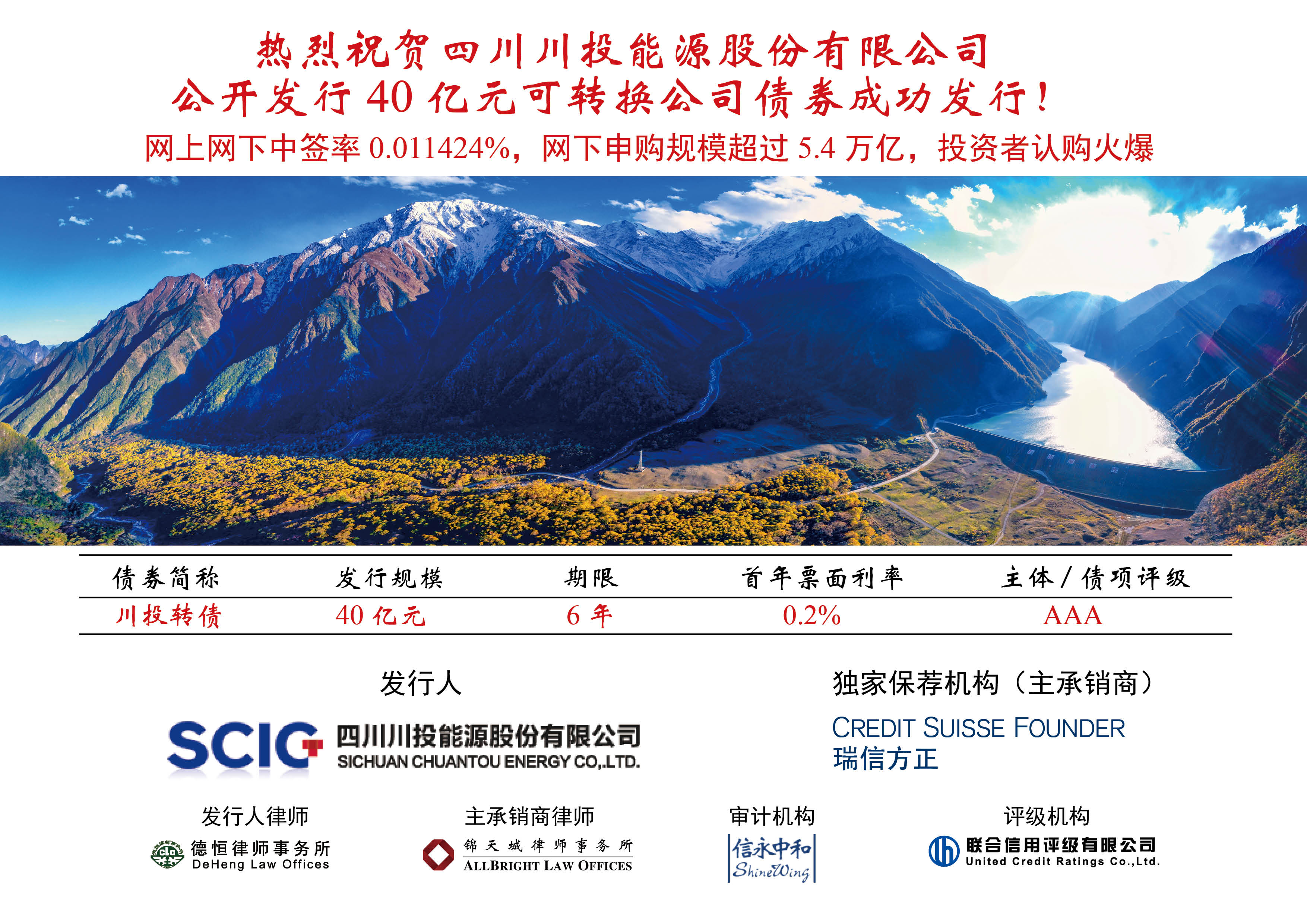 本次可转债(简称“川投转债”)发行规模40亿元,每张面值100元,共计4000万张,期限6年,首年票面利率0.2%,综合年化票面利率1.83%,主体/债项评级AAA级,初始转股价格为9.92元/股。募集资金将全部用于黑料网 重要参股的雅砻江杨房沟水电站项目建设,开启了雅砻江中游流域水电站借助资本市场募集建设资金的历史先河。
