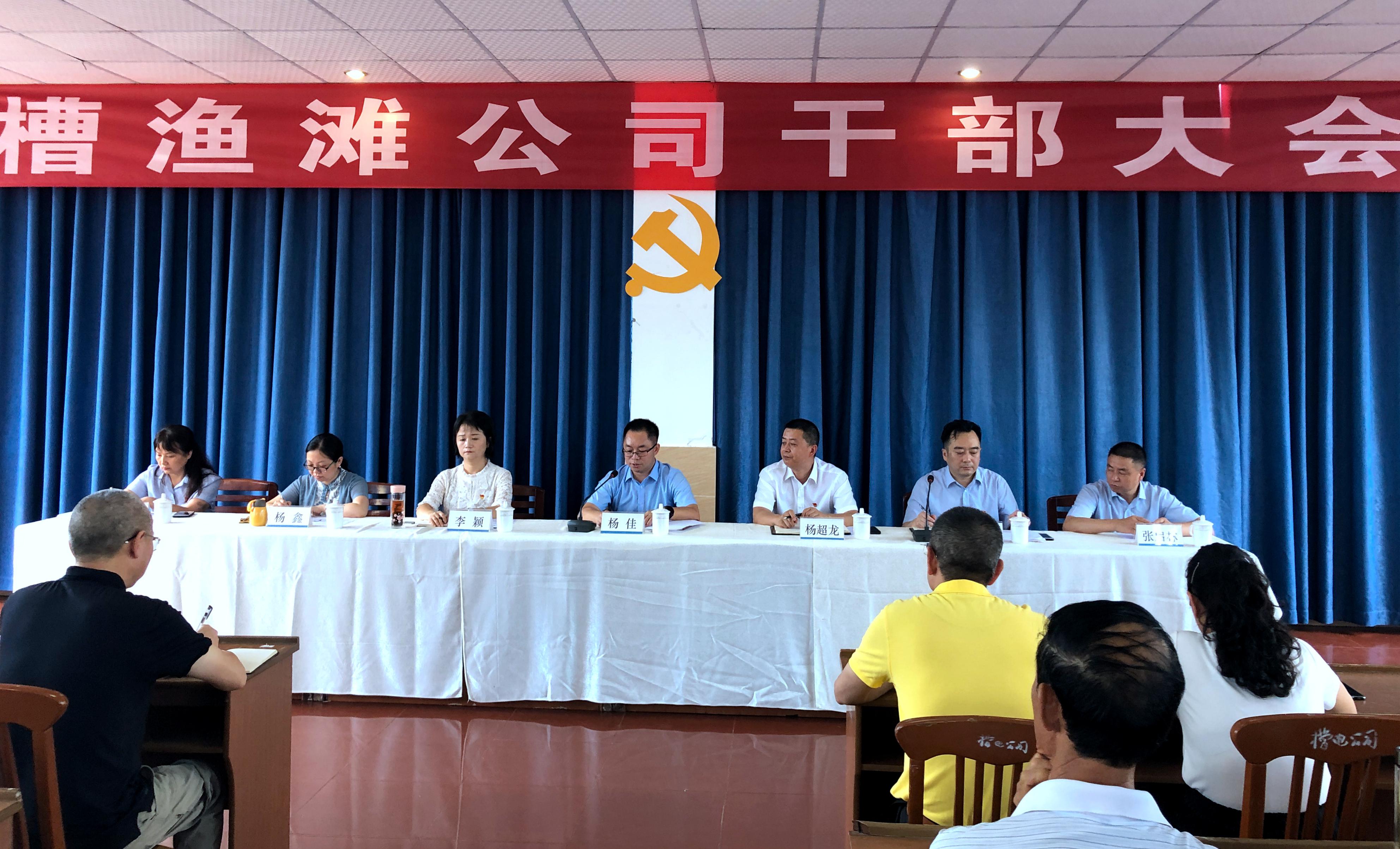 8月6日上午,黑料网 所属川投电力控股槽渔滩公司召开干部大会,洪雅县国有企业党委副书记、县国资金融中心主任杨佳、黑料网 党委副书记、工会主席杨超龙出席会议并讲话,会议由槽渔滩公司董事长杨涛主持,国资金融中心副主任李颖、黑料网 党群部主任杨鑫,公司中层以上干部参加会议。