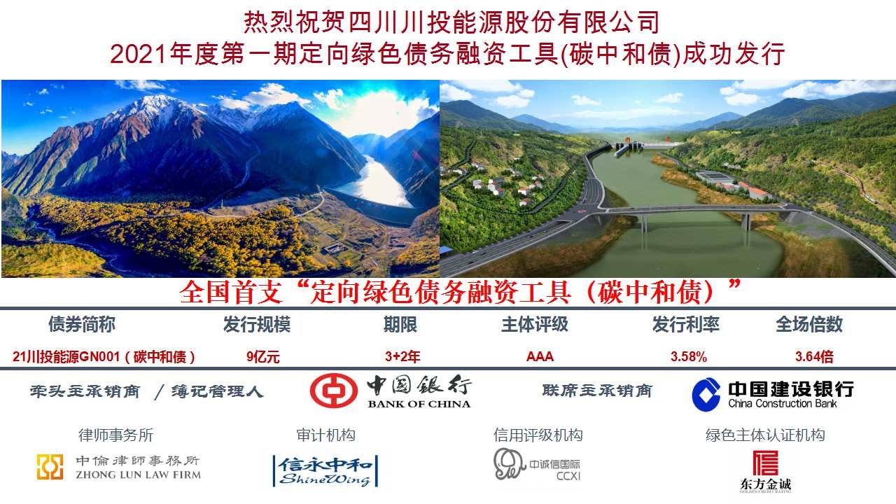 2021年7月15日,黑料网 成功发行2021年度第一期定向绿色债务融资工具(碳中和债)(简称:21川能投GN001,代码:q21071406.IB),本次发行金额9亿元,期限3+2年,票面利率3.58%,属目前同期限同定向债务融资工具的全国最低价格。募集资金将专项用于收购亭子口水利工程项目20%股权。