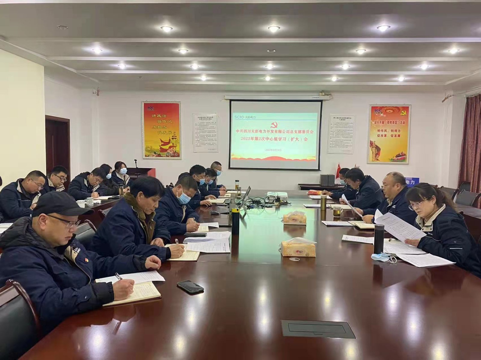 2月14日下午,天彭电力党总支在公司二楼会议室召开2022年第2次中心组学习(扩大)会,专题学习研讨2021年度基层党组织组织生活会学习内容,为开好组织生活会、做好民主评议党员工作打牢思想基础。公司领导、党员干部、关键岗位人员参加会议,会议由公司党总支书记、董事长、总经理陈忠主持。