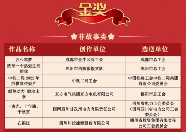 在热烈庆祝党的二十大胜利召开之际,由四川省总工会主办的本次大赛受到了各地市州、央企、国企的热烈追捧,选送故事类作品137部,非故事类作品685部。经过初评初评,共有245部作品入围终评。经过专家评委的综合评审,最终评选出故事类、非故事类作品金奖各6部、银奖各8部、铜奖各12部,优秀奖各25部。可谓百花齐放、精彩纷呈,竞争十分激烈。