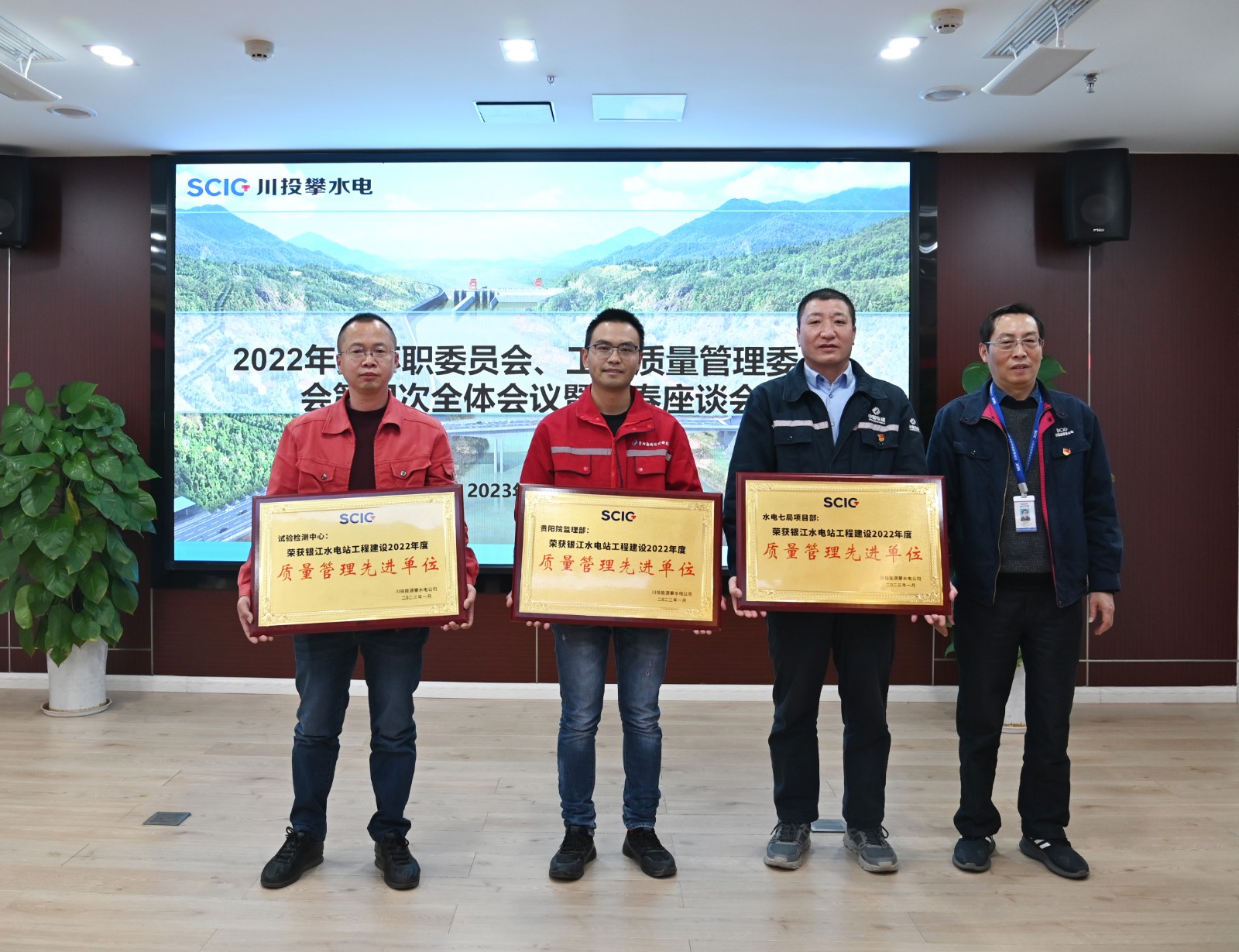 会上,公司党总支副书记、董事会秘书、工会主席邓勇宣读了《关于表彰银江水电站2022年度质量管理先进单位、先进集体和先进个人的通报》文件,徐孝刚向荣获2022年度质量管理先进单位的试验检测中心、贵阳院监理部、水电七局项目部颁发了奖牌,公司总经理助理兼工程管理部经理严瑞平向先进集体代表颁发了奖牌。吴巍屿组织参会人员向获奖的单位、集体及个人表示了祝贺,要求其在今后的质量管理工作中发挥好先锋模范带头作用,促进各参建单位共同提高质量管理水平,把银江水电站建设成“精品工程、样板工程、阳光工程”。