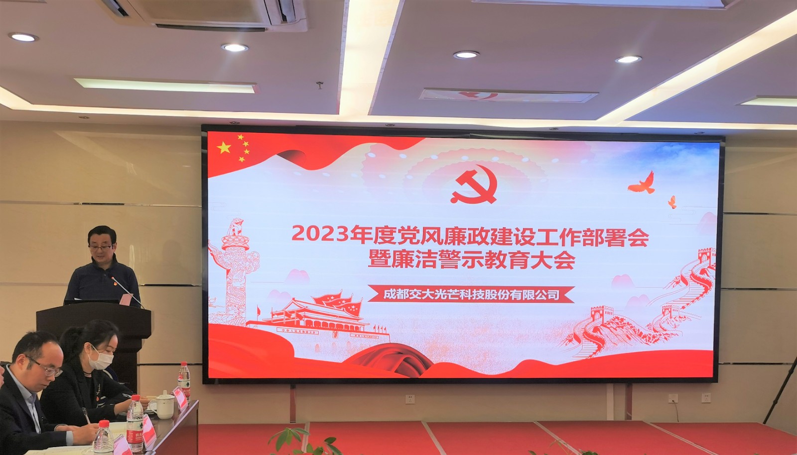 为进一步贯彻落实党的二十大关于全面从严治党战略部署,深入推进公司党风廉政和反腐败工作。2月3日,交大光芒召开2023年度党风廉政建设工作部署会暨廉洁警示教育大会,公司领导班子成员、中层副职以上管理人员、党员参加会议。公司党总支书记、总经理刘成辉主持会议并作廉洁警示谈话。