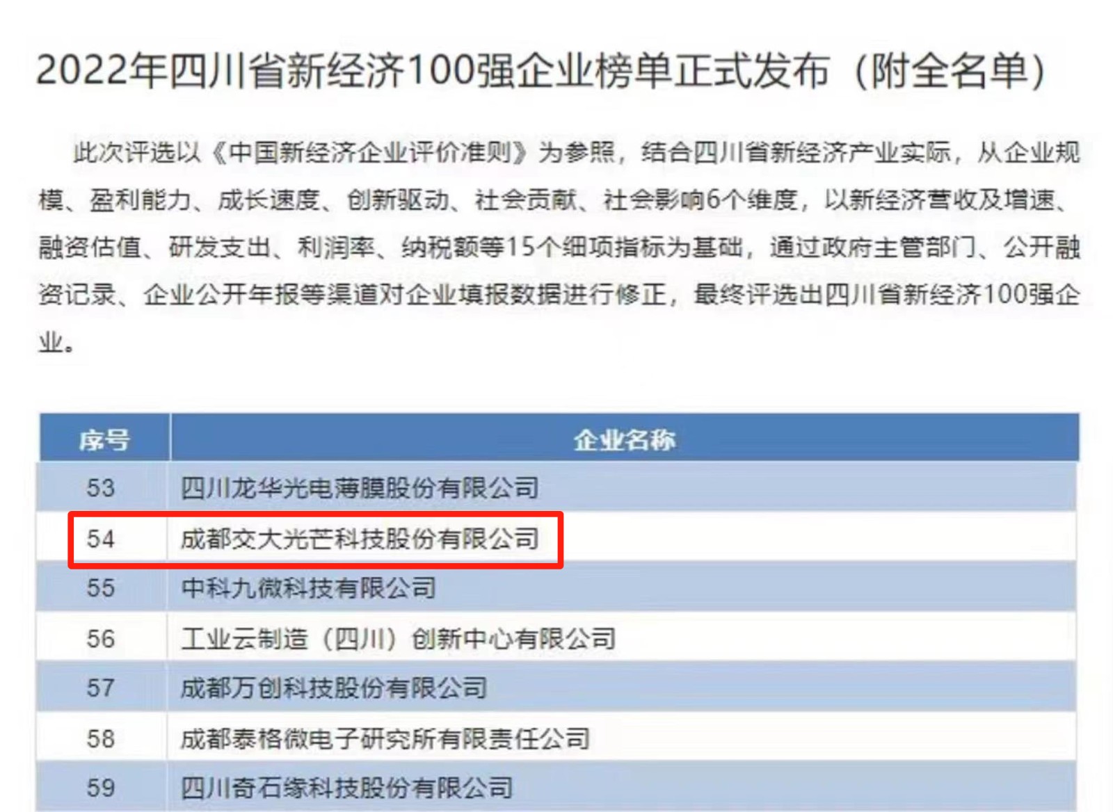 近日,四川省工业和信息化研究院发布“2022年四川省新经济100强企业榜单”,交大光芒成功获评入围,标志其位居四川省以新技术、新产业、新业态、新模式为特征的新经济企业的前列。