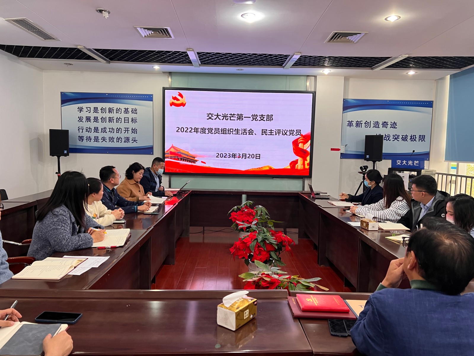 3月20日,按照党总支工作部署要求,交大光芒第一党支部召开了2022年度组织生活会并开展民主评议党员。公司党总支书记、总经理刘成辉到会督导并点评。第一支部书记、公司副总工程师兼研发中心副总经理王辉博士主持会议。党总支委员汪志桥按照双重组织生活要求,以普通党员身份参加支部组织生活会。