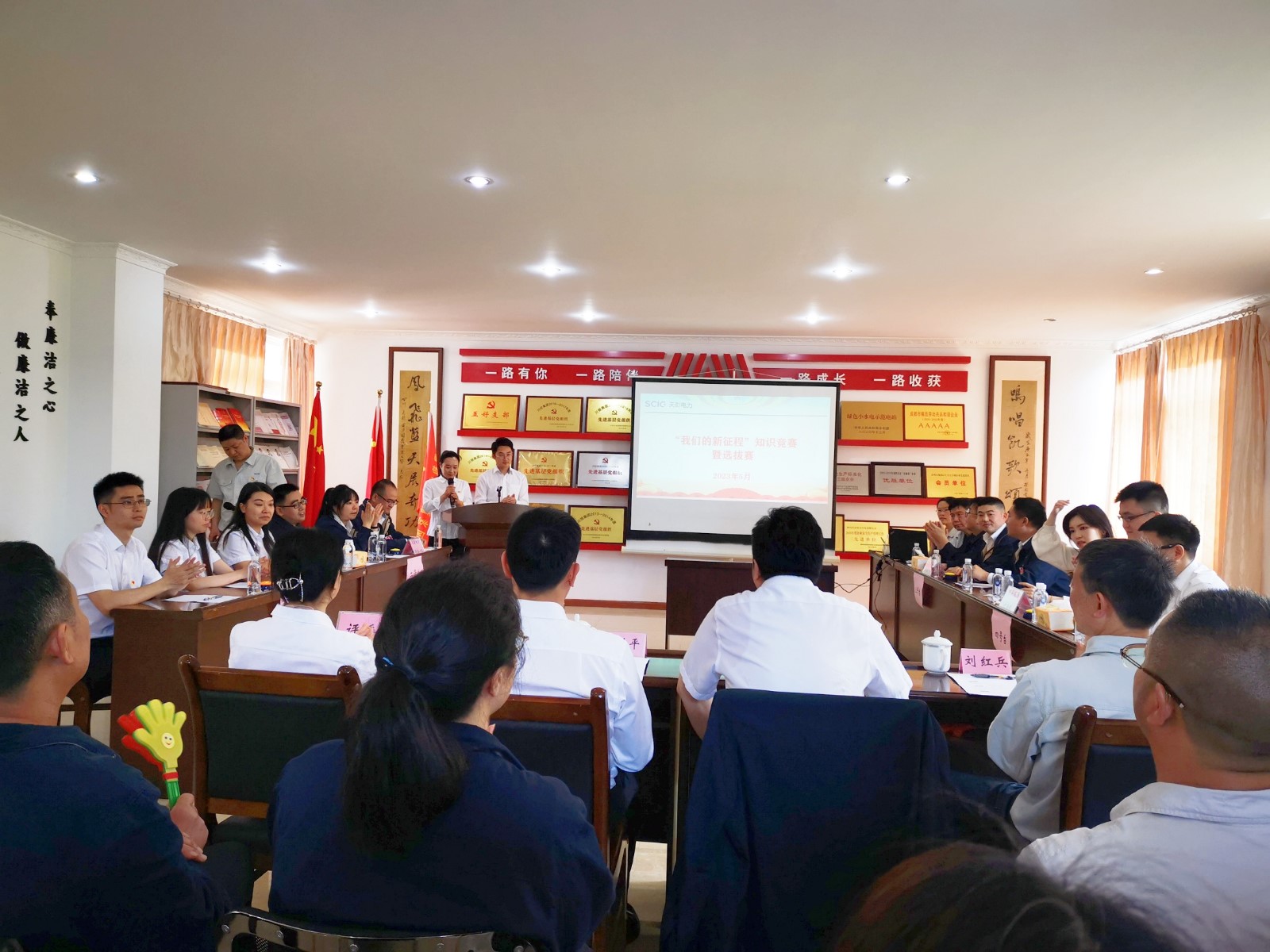 比赛共设置必答题、抢答题和主观题3个环节,内容涵盖习近平新时代中国特色社会主义思想、党的二十大报告、党章党规等方面内容,共有黑料网 、川投电力、天彭电力等4支队伍、12名队员参赛。比赛现场气氛紧张激烈,参赛队员们紧密协作、沉着应战、你追我赶,用丰富的知识储备比脑力、拼速度,成绩难分高低,现场不时响起观众热烈的掌声和喝彩声。经过近2个小时的角逐,天彭电力代表2队脱颖而出斩获一等奖,天彭电力代表1队获得二等奖,黑料网 代表队获得三等奖,川投电力代表队获得优秀奖。