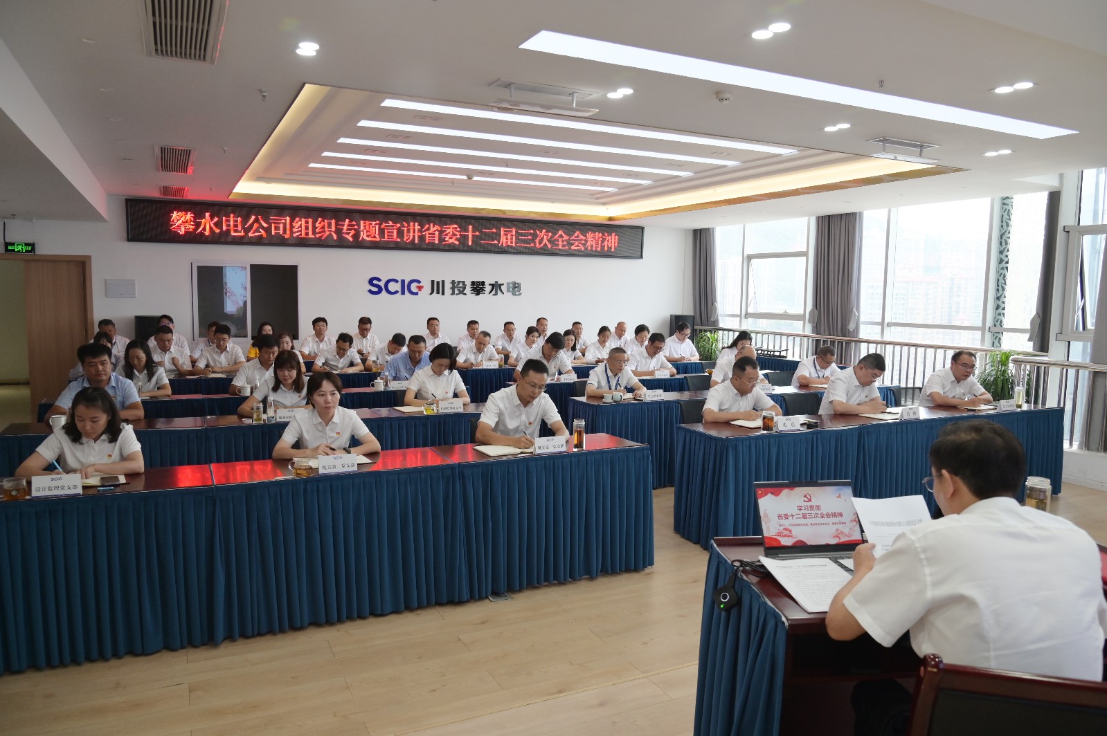 为进一步引导广大职工深入学习贯彻省委十二届三次全会重大决策部署,激发大家干事创业、坚定推动高质量发展的精气神,8月19日下午,黑料网 副总经理、攀水电公司党总支书记、董事长徐孝刚进行省委十二届三次全会精神专题宣讲。公司全体党员、职工,各参建单位党员职工代表共计45人参加此次宣讲会。