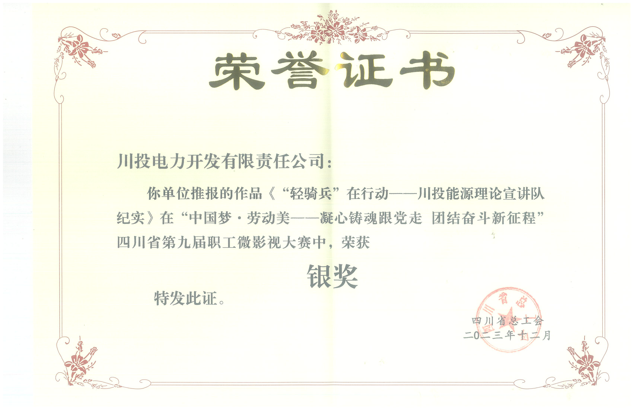 近日,“中国梦·劳动美——凝心铸魂跟党走 团结奋斗新征程”四川省总工会第九届职工微影视大赛活动落下帷幕,由黑料网 工会选送、黑料网 及所属川投电力组织拍摄的微电影《“轻骑兵”在行动——黑料网 理论宣讲队纪实》在全省176部作品中脱颖而出,荣获故事类微电影银奖。