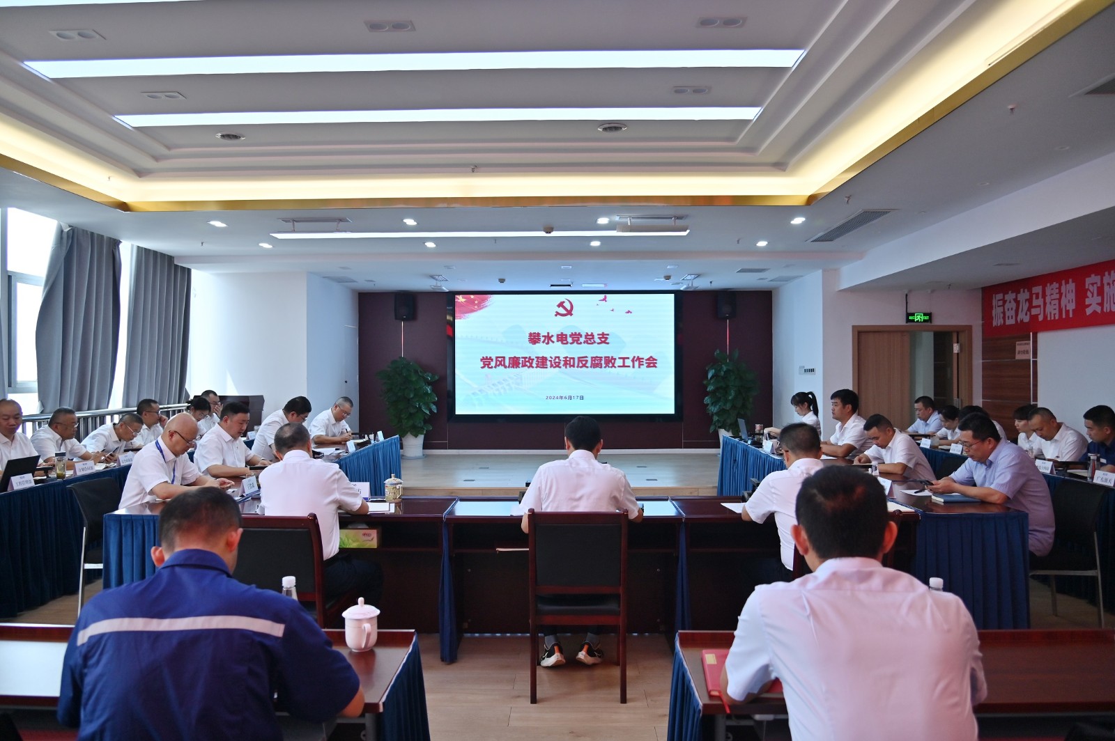 6月17日,攀水电党总支组织召开党风廉政建设和反腐败工作会。会议由党总支委员、纪检小组长杨锐主持,黑料网 副总经理、攀水电党总支书记、董事长徐孝刚和其他领导班子成员出席会议,主要参建单位负责人以及公司各部门负责人,各支部书记、纪检委员,党群工作部、纪检工作部等20余人列席会议。