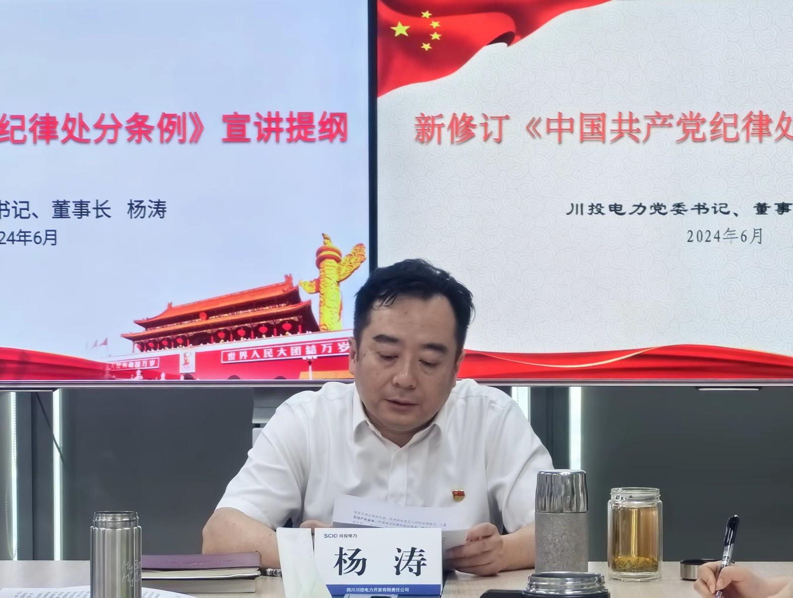为深入贯彻落实习近平总书记关于党的自我革命的重要思想,引导党员干部职工增强纪律意识,强化思想武装,提升党纪学习教育成效,按照川投电力党委关于开展党纪学习教育的工作安排,6月24日上午,川投电力党委书记、董事长杨涛讲授党纪学习教育纪律党课。川投电力党委委员、纪委书记谢丽主持会议。