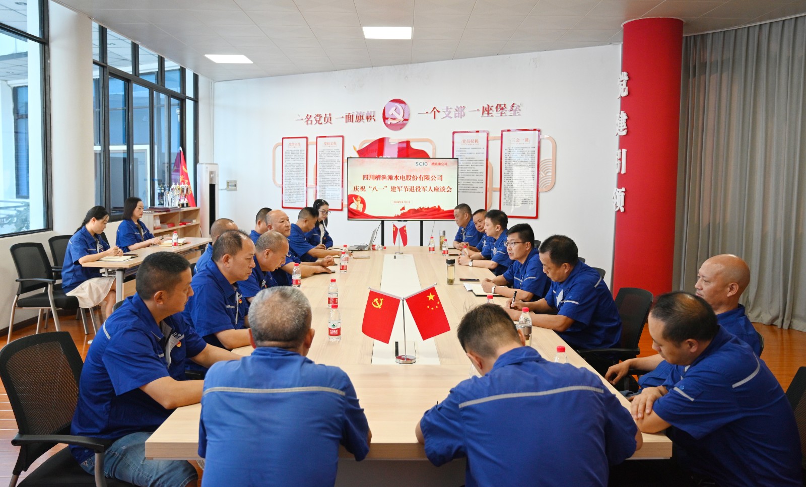 8月1日上午,槽渔滩公司、天彭电力公司组织召开退役军人座谈会,集中学习习近平总书记对退役军人工作作出重要指示精神,退役军人代表回忆了自己难忘的军旅生涯,畅谈了在工作中的感想和体会,公司领导班子成员向退役军人代表送上了节日慰问,退役军人齐唱军歌《咱当兵的人》《团结就是力量》,在整齐嘹亮的歌声中,共庆“八一”建军节。