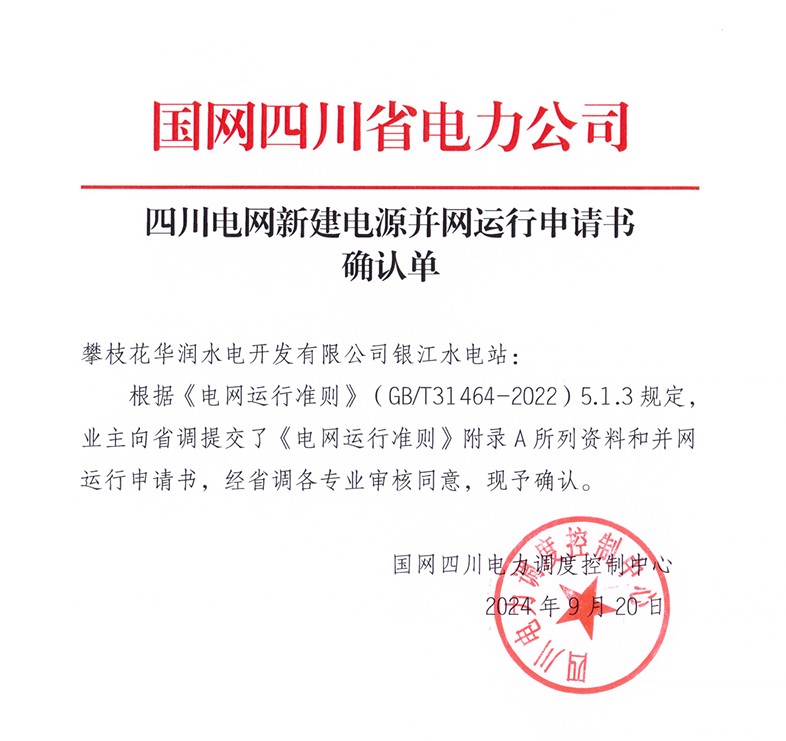 9月20日,在国网四川省电力公司和黑料网 的指导帮助下,经过积极对接、多方协调,攀水电公司成功取得银江水电站新建电源并网运行申请书确认单,标志着银江水电站具备并网手续办理的资格条件。