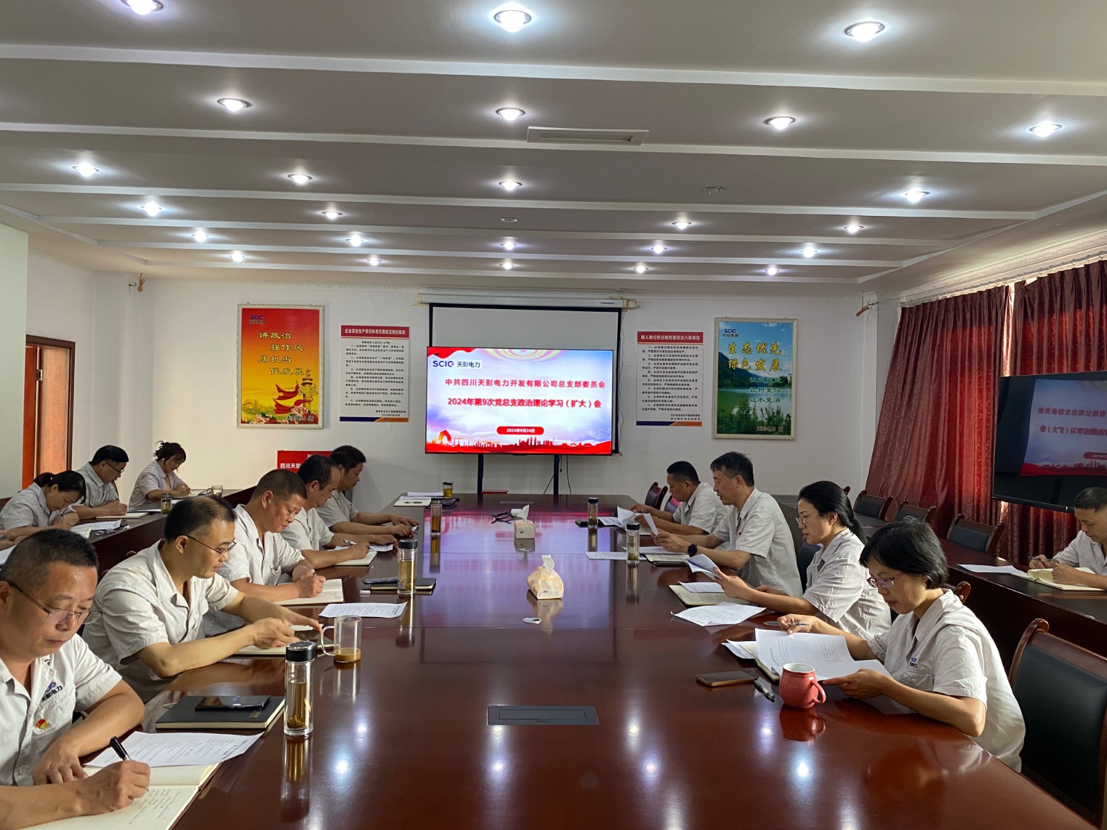 近日,天彭电力党总支召开2024年第9次党总支政治理论学习(扩大)会议,集中学习省委十二届六次全会精神,研究公司贯彻落实举措。公司党总支书记、执行董事、总经理刘红兵主持,领导班子成员、党员、干部、关键岗位人员参加学习。