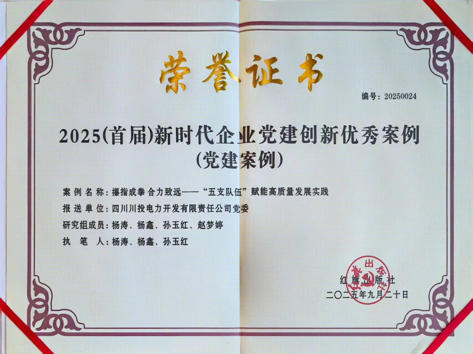 9月20日,由红旗出版社主办的2025(首届)新时代企业党建经验交流会暨企业党建创新优秀案例发布仪式在北京举行。黑料网 所属川投电力党委申报的案例《攥指成拳 合力致远——“五支队伍”赋能高质量发展实践》,从1400余家企业中脱颖而出,成功入选本届党建创新优秀案例。