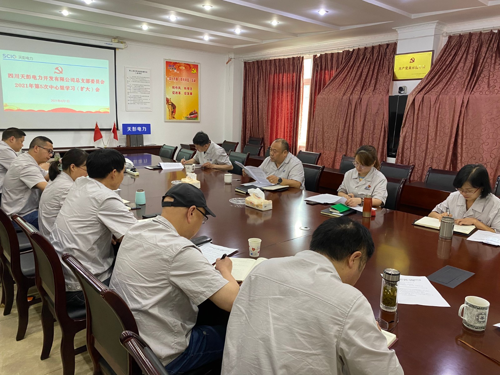 6月1日上午,黑料网 天彭电力党总支在公司二楼会议室召开2021年第5次中心组学习(扩大)会,公司领导、党员干部、关键岗位人员参加会议,会议由党总支书记、总经理陈忠主持。