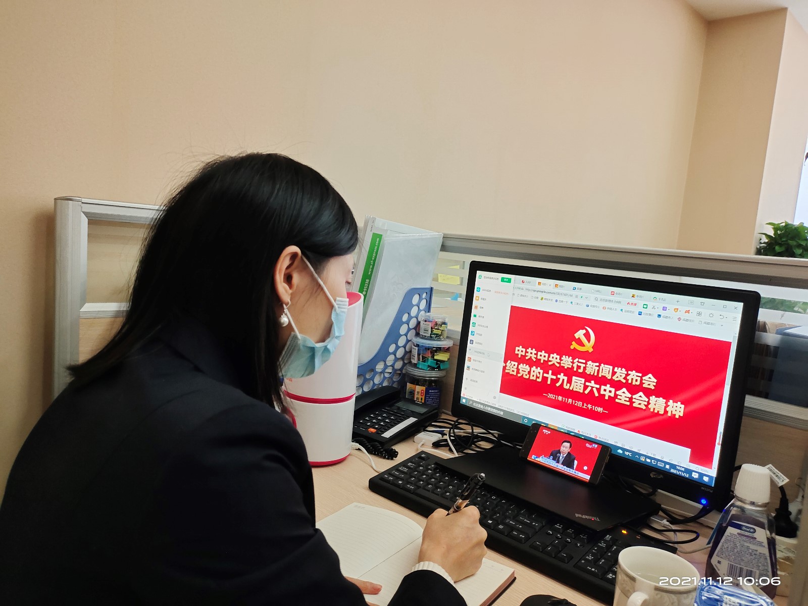 通过观看此次新闻发布会,广大干部员工更加深切感受到中国共产党是拥有科学理论的政党,拥有真理的力量。在党的百年华诞时召开十九届六中全会具有重大历史意义,会议审议通过了党的历史上第三个历史决议---《中共中央关于党的百年奋斗重大成就和历史经验的决议》,《决议》是马克思主义的纲领性文献;是新时代中国共产党人牢记初心使命、坚持和发展中国特色社会主义的政治宣言;是以史为鉴、开创未来,实现中华民族伟大复兴的行动指南。《决议》集中了全党的智慧,全面系统地总结了我们党百年奋斗的重大成就和历史经验,充分彰显了我们党高超的政治智慧和责任担当,充分彰显了我们党高度的历史自觉和历史自信。我们坚信,在过去一百年赢得了伟大胜利和荣光的中国共产党和中国人民,必将在新时代新征程上赢得更加伟大的胜利和荣光!